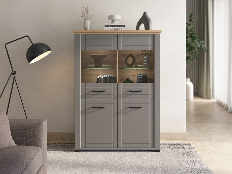 Vitrină VALENCIA 2K VS2 într-o combinaţie de decor de stejar artizanal, gri grafit şi folie gri mat, aduce în spațiu un aspect mai subtil, monocromatic. Spaţiul util este alcătuit din două elemente închise şi două elemente vitraliu, care în interior au etajere practic amenajate pentru depozitare. Fronturile sunt îmbogățite cu mânere negre de design simplu, care sunt în conformitate cu linia de design a întregii colecții. Aparține sistemului omonim de elemente VALENCIA, care se caracterizează prin funcționalitate și caracter practic la care contribuie, atât un număr mare de elemente în sistem, cât și o excelentă organizare a spațiului de depozitare. Vitrina VALENCIA 2K VS2 are posibilitatea adăugării iluminării LED .