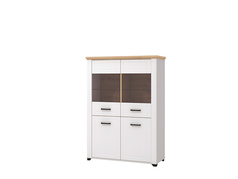 Vitrină VALENCIA 2K VS2 într-o combinaţie de decor de stejar artizanal, alb opac şi folie alb mat, este o soluţie design atractivă pentru decorarea livingului, care oferă o estetică mai caldă interiorului. Spaţiul util este alcătuit din două elemente închise şi două elemente vitraliu care în interior au etajere practic amenajate pentru depozitare. Fronturile sunt îmbogățite cu mânere negre de design simplu, care sunt în conformitate cu linia de design a întregii colecții. Aparține sistemului omonim de elemente VALENCIA, care se caracterizează prin funcționalitate și caracter practic la care contribuie, atât un număr mare de elemente în sistem, cât și o excelentă organizare a spațiului de depozitare. Vitrina VALENCIA 2K VS2 are posibilitatea de adăugare iluminare LED.