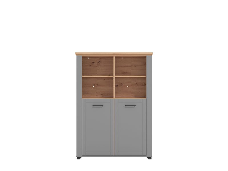 Vitrină VALENCIA POP 2K într-o combinaţie de decor de stejar artizanal, gri grafit şi folie gri mat, aduce în spațiu un aspect mai subtil, monocromatic. Spaţiul util este alcătuit dintr-un element deschis şi un element închis, care în interior are etajer pentru depozitare. Fronturile sunt îmbogățite cu mânere negre de design simplu, care sunt în conformitate cu linia de design a întregii colecții. Aparține sistemului omonim de elemente VALENCIA, care se caracterizează prin funcționalitate și caracter practic la care contribuie, atât un număr mare de elemente în sistem, cât și o excelentă organizare a spațiului de depozitare.