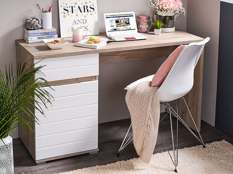 Datorită design-ului și organizării spațiului util, măsuța de calculator ELAN, cu desen de stejar gri și lac alb, este alegerea ideală pentru mobilarea unei camere de lucru, unde totul va fi la locul său. Soluția închisă și sertarul practic oferă destul spațiu pentru depozitarea cărților și celor mai diverse obiecte necesare pentru a lucra fără nicio piedică.