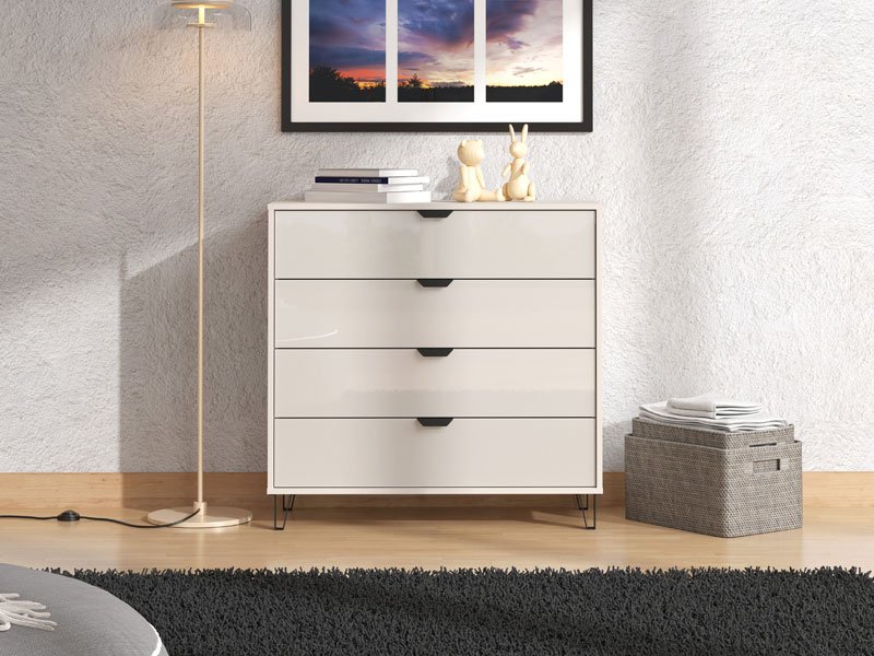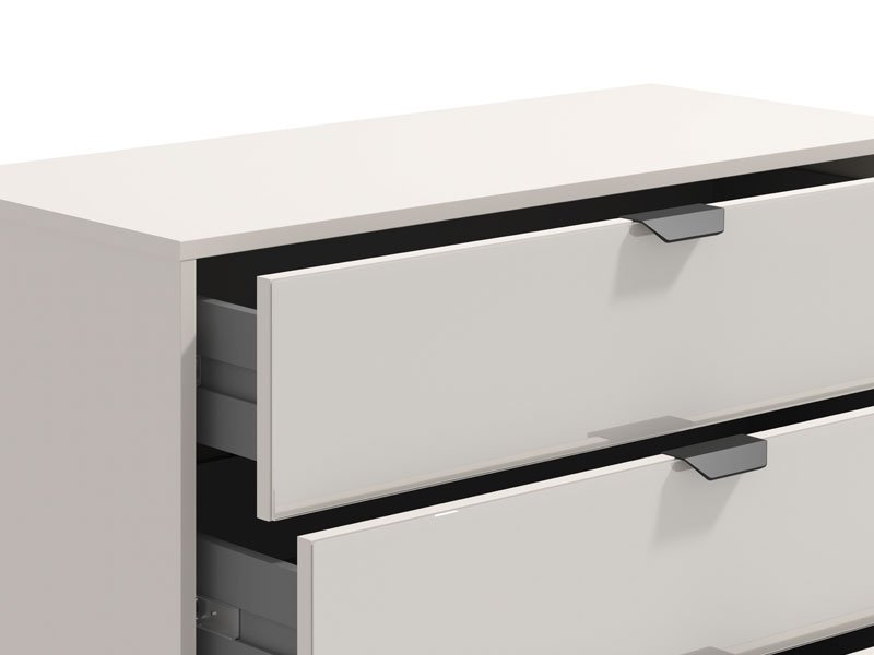 Cu o combinație de decor de cașmir și sticlă de culoare cașmir, comoda LUCCA 4F este o soluție de design atractivă și funcțională pentru amenajarea unui dormitor modern. Spațiul util perfect amenajat este alcătuit din patru sertare practice.