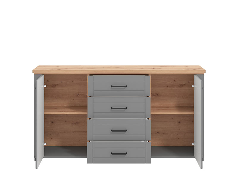 Comodă VALENCIA 3K4F într-o combinaţie de decor de stejar artizanal, gri grafit şi folie gri mat, aduce în spațiu un aspect mai subtil, monocromatic. Spaţiul util este alcătuit din sertare practice în partea centrală şi două elemente închise, care au etajere practic amenajate pentru depozitare. Fronturile sunt îmbogățite cu mânere negre de design simplu, care sunt în conformitate cu linia de design a întregii colecții. Aparține sistemului omonim de elemente VALENCIA, care se caracterizează prin funcționalitate și caracter practic la care contribuie, atât un număr mare de elemente în sistem, cât și o excelentă organizare a spațiului de depozitare.