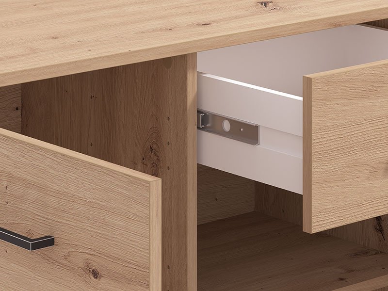 Spațiul util perfect amenajat al acestei comode este alcătuit din patru compartimente închise și două sertare practice.