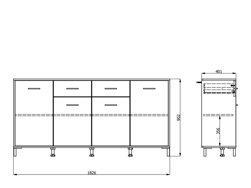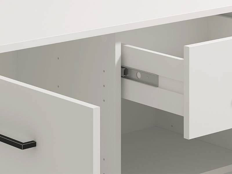 Spațiul util perfect amenajat al acestei comode este alcătuit din patru compartimente închise și două sertare practice.