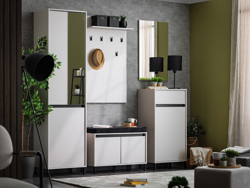 Cu decor de cașmir, detalii realizate din folie negru mat și o oglindă, elementul de hol ARRAN P1 OG aduce prospețime și eleganță în hol. Interiorul este format dintr-un suport extensibil pentru umerașe și rafturi de depozitare. Se poate combina cu alte elementele din colecția ARRAN pentru hol, care completează intrarea în locuința dvs.