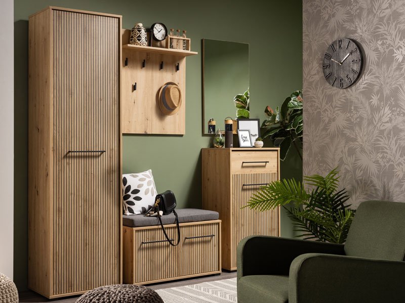 Cu o combinație de decor de stejar artizanal și stejar artizanal cu dungi, elementul de lobby LANDES are o parte practică închisă, alcătuită din două segmente, pentru depozitarea pantofilor, și o pernă cu model gri pe care vă puteți așeza. Se poate combina cu alte elementele din colecția LANDES pentru hol, care completează interiorul întrării în locuința dvs.