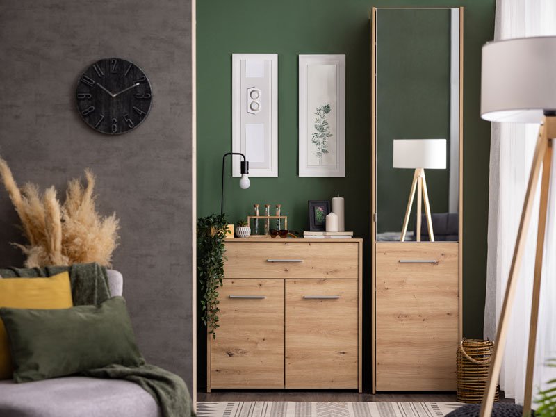 Modelul pantofarului MENORICA 1K OG, în decor de stejar artizanal, este îmbogăţit cu o oglindă practică în partea superioară a elementului. În interior există etajeree închise pentru depozitarea încălţămintei, ceea ce oferă posibilitatea organizării raționale a holului.