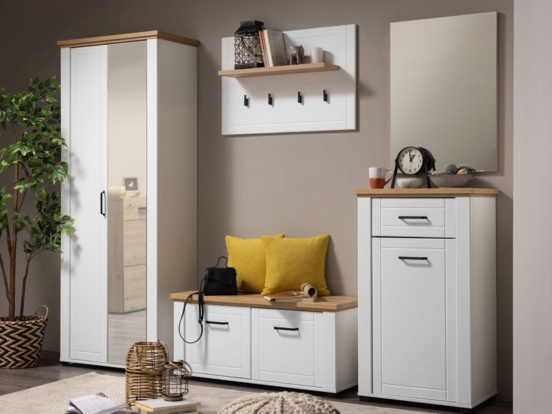 Elementul holului VALENCIA 1K1F într-o combinație de stejar artizanal, alb opac și folie albă mată, este o combinație de căldură a farmecului rustic și a seriozităţii ambientale, care vine prin liniile de design potrivite. Fronturile sunt îmbogățite cu mânere negre de design simplu, care sunt în conformitate cu linia de design a întregii colecții. Spaţiul util este alcătuit dintr-un sertar şi un segment practic închis pentru depozitarea încălţămintei. Face parte din sistemul omonim de elemente de amenajare a atmosferei holului, care se caracterizează prin funcționalitate și caracter practic la care contribuie un număr mare de elemente din sistem, precum și o organizare excelentă a spațiului de depozitare.