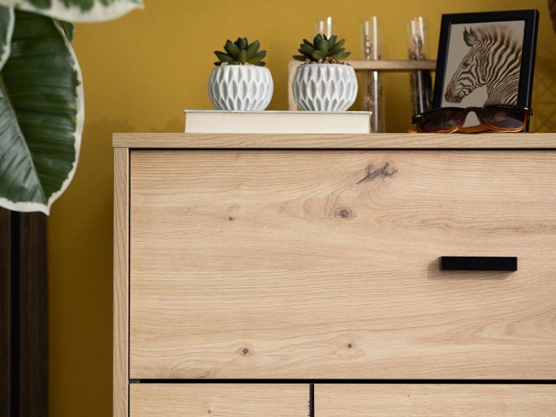 Cu decor de stejar artizanal și imprimeu, comoda ALERIA 80 3F contribuie la amenajarea practică a dormitorului și aduce un stil modern în ambianța dormitorului datorită designului atractiv care accentuează dungile negre de pe decorul din lemn, precum și mânerele și picioarele negre coordonate.