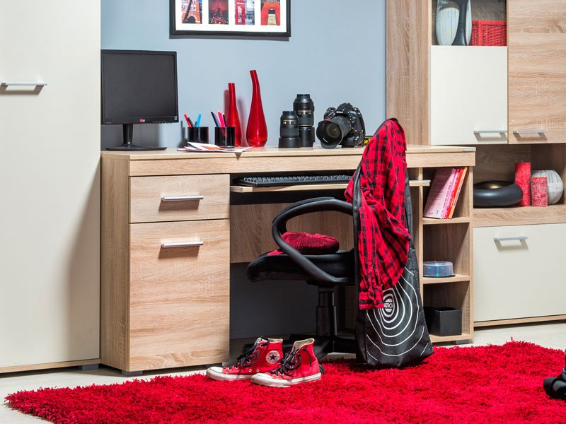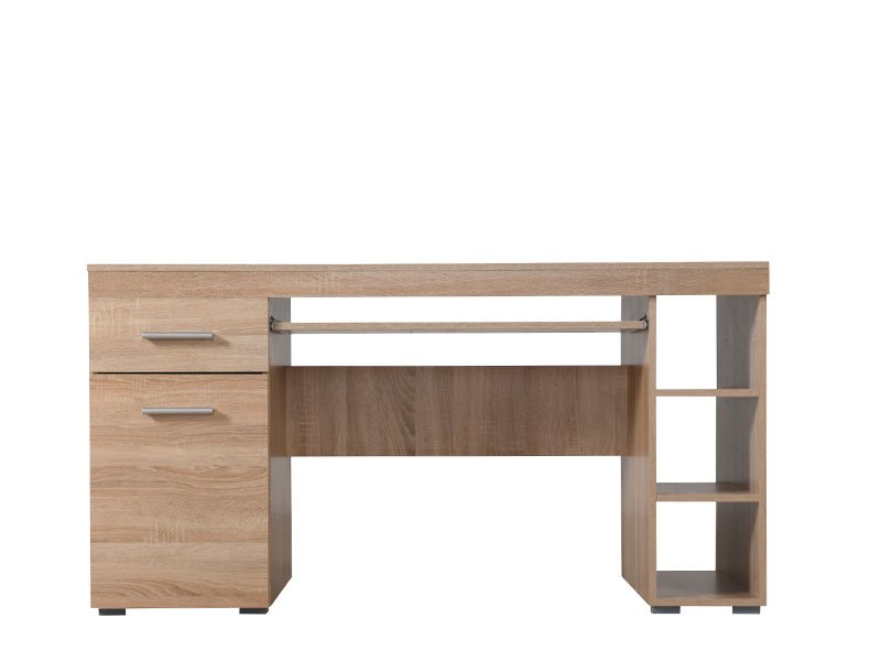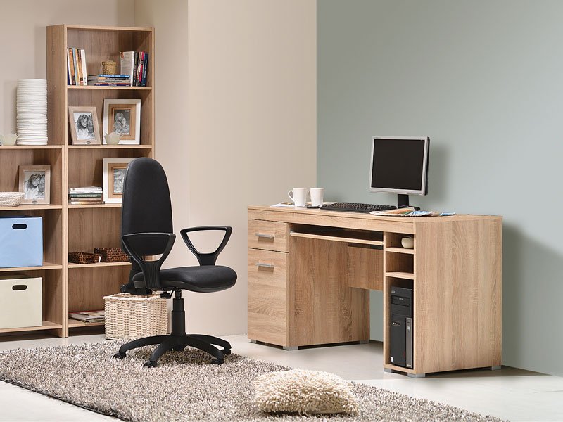 Masă serioasă pentru proiecte serioase- cu raft pentru tastatură, care alunecă și cu sertare și rafturi închise pentru utilizarea maximă a spațiului pentru depozitare. Pe partea cealaltă se găsesc rafturi deschise pentru depozitarea CD-urilor și cutia calculatorului. Masa de calculatoare ALFA, în modelul stejar, va fii un oaspete ideal în fiecare cameră de lucru.