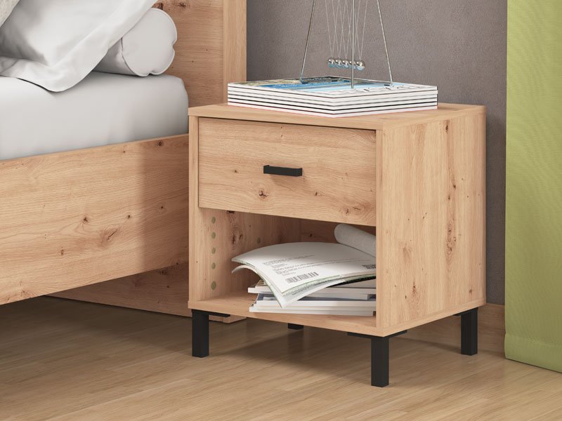 Cu decor de stejar artizanal, noptiera ALERIA NO1F contribuie la amenajarea practică a dormitorului, iar datorită designului său neutru se poate încadra de minune în dormitoare cu ambianțe diferite. Are un sertar și un raft de depozitare. Face parte din sistemul de elemente cu același nume pentru amenajarea dormitorului ALERIA.