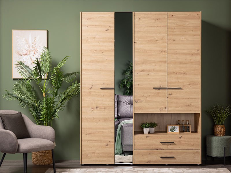 Cu un model de stejar artizanal, o tijă de dulap în partea stângă și rafturi închise cu două aripi plus un raft deschis și două sertare în partea dreaptă, dulapul LEON 4K2FO va contribui la organizarea funcțională a ambianței. Oglinda din partea centrală a dulapului LEON 4K2FO va îmbogăți estetic spațiul de locuit și va face ca să pară a fi mai mare.