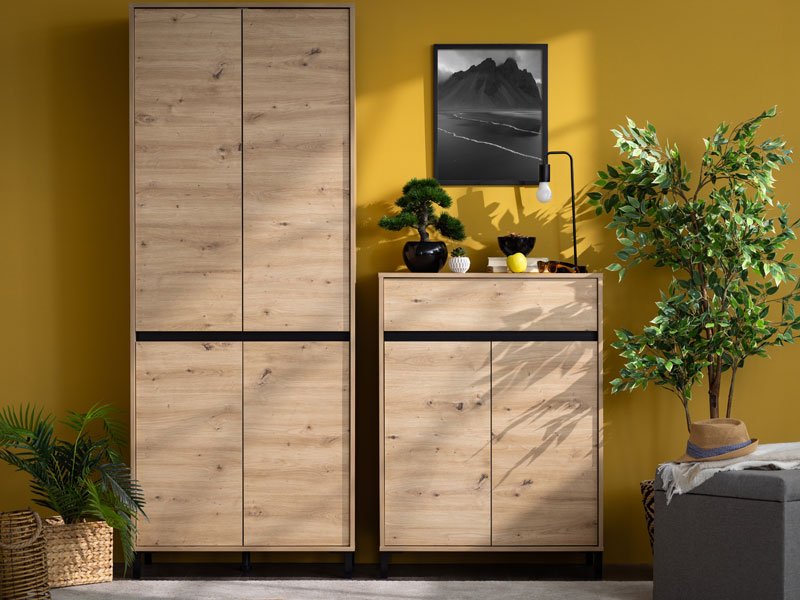 Cu decor de stejar artizanal și detalii realizate din folie negru mat, pantofarul FLANNAN 2K4V este o soluție modernă și funcțională pentru depozitarea încălțămintei, potrivită și pentru holurile cu dimensiuni reduse, integrându-se armonios în orice stil de amenajare a locuinței. Ceea ce deosebește acest model de hol este funcționalitatea sa. Are 2 părți închise cu două aripi și rafturi pentru depozitarea pantofilor.