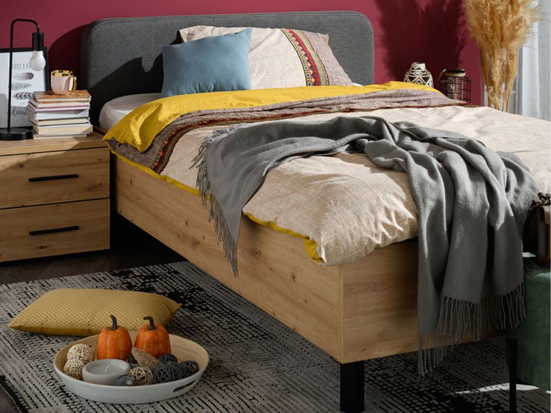 Cu decor de stejar artizanal, cap tapițat și picioare negre, patul BARLETA 120 a fost conceput pentru amenajarea unui loc pentru odihnă și somn. Se potrivește cu aproape orice ambianță și este compatibil cu o saltea de 120cm x 200cm.