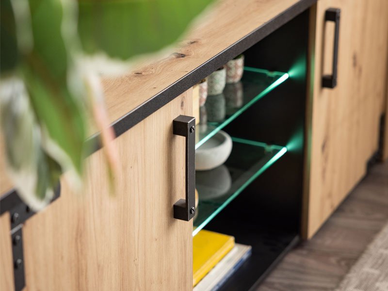 TV Polita LAZIO 170 este o combinație de stejar artizanal, decor negru și detalii în formă de fitinguri metalice pe fronturi. Cu forma sa estetică și designul său practic, cu două segmente laterale închise și o parte deschisă cu două rafturi vitrate, această comodă contribuie în mod eficient la organizarea unei camere de zi de calitate. Face parte din colecția LAZIO, care completează interiorul și reprezintă expresia autentică a unei combinații între stilul industrial și căldura decorului din lemn. Există posibilitatea de a instala dispozitive adiționale de iluminat.